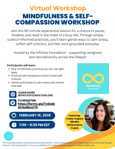 Join this 90-minute experiential session for a chance to pause, breathe, and reset in the midst of a busy life. Through simple, science-informed practices, you’ll learn gentle ways to calm stress, soften self-criticism, and feel more grounded everyday. Hosted by the Infinitas Foundation – supporting caregivers and neurodiversity across the lifespan.